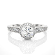 This stunning engagement ring is a masterpiece of fine craftsmanship and exquisite design, perfectly combining the beauty of a 1.00 carat Round lab-grown diamond with the sparkle of pave-set diamonds. The Round diamond is of exceptional quality, with brilliant cut facets that maximize its natural radiance and fire. The diamond is set in a Double halo design, which adds depth and dimension to the ring by framing the center stone with smaller accent diamonds that appear to float invisibly above the surface of the ring.