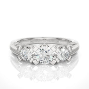 This stunning brilliant three stone with accents engagement ring is a masterpiece of fine craftsmanship and exquisite design, perfectly combining the beauty of a 1.20+ carat Round lab-grown diamond with the sparkle of three stone diamonds. The Round diamond is of exceptional quality, with brilliant cut facets that maximize its natural radiance and fire. The diamond is set in a three stone shank design, which adds depth and dimension to the ring by framing the center stones appear to float invisibly above the surface of the ring.